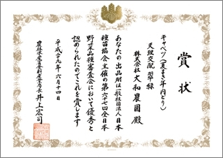 弊社の天理交配「翠緑(試行161号)」キャベツが、一般社団法人日本種苗協会主催の第67回全日本野菜品種審査会において優秀と認められ、農林水産省食料産業局長の井上宏司様より賞状とトロフィーを頂きました。