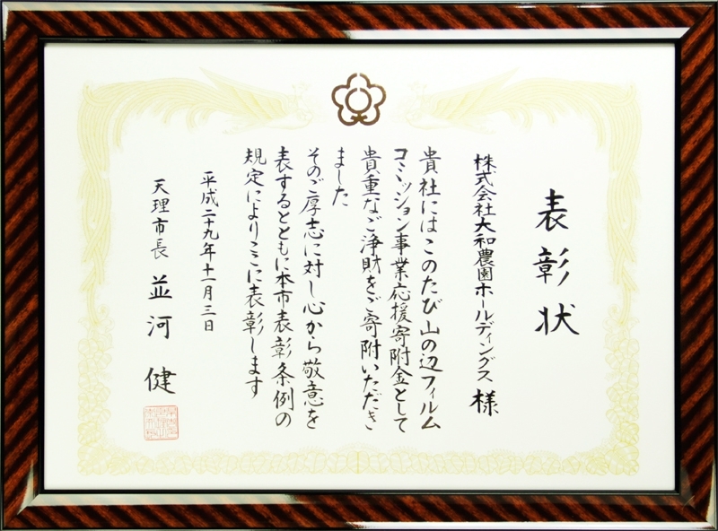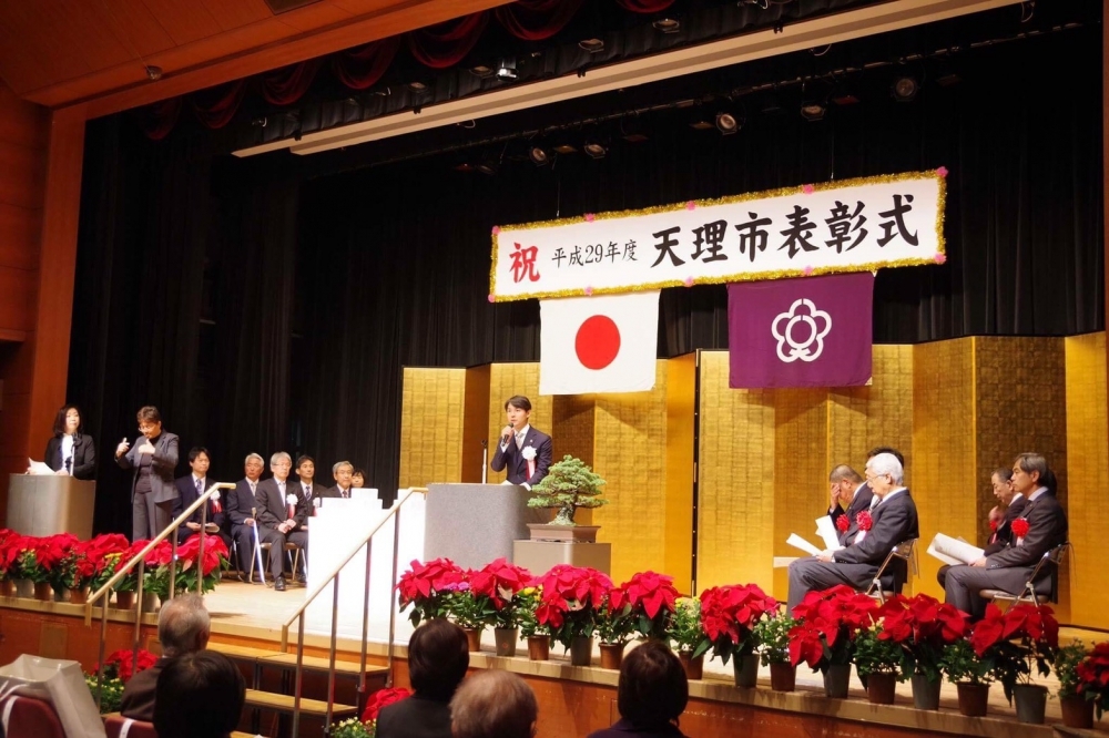 平成29年度天理市表彰式(平成29年10月17日開催)において、天理市長の並河 健様から表彰状を頂きました。