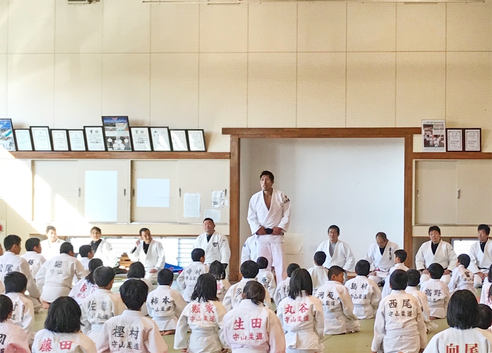守山中学校武道場において、柔道家篠原信一氏による柔道教室が開かれました。