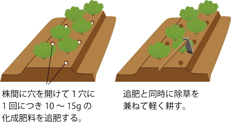 ・年内までに1~2回の追肥を行い、収穫前までの株作りに努める(目安:1回目は定植から約20日目、2回目は1回目の約20日後)。わき芽形成までの葉枚数確保が収量増につながる。