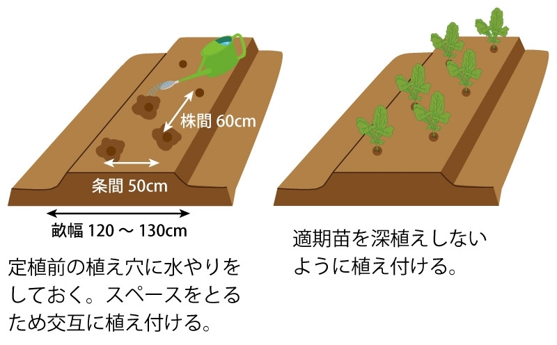 ・本葉4~5枚の苗を、畝幅120~130cm、条間50cmの2条立てで、株間60cm程度を目安に定植。