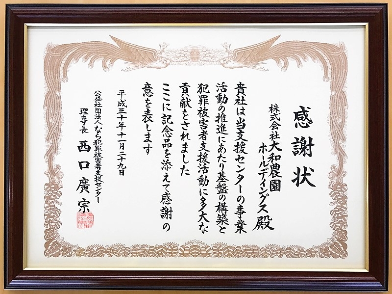 犯罪被害者支援奈良県民のつどい(2018年11月29日開催)において、なら犯罪被害者支援センター理事長の西口 廣宗様から感謝状をいただきました。