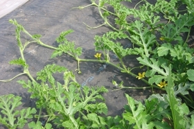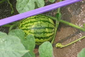 スイカは果実が着いてから肥料分を多く必要とします。雌花が咲く前に肥料が効きすぎると果実が着きにくくなったり、収穫間際になって肥料が効きすぎると甘味が少なくなったりします。