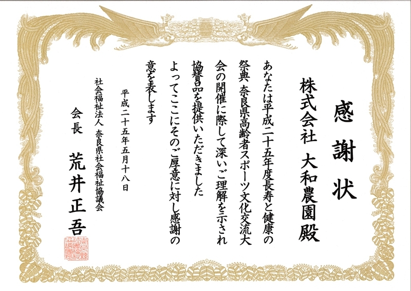 平成25年度「長寿と健康の祭典」奈良県高齢者スポーツ文化交流大会(5月18、19日開催)へ協賛品として野菜種子200名様分を提供致しました。主催の社会福祉法人 奈良県社会福祉協議会様より感謝状をいただきました。