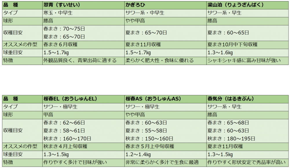 さて弊社が現在取り扱っているキャベツの品種を表に示しました。弊社の品種で最も栽培期間が短い品種は「おてがるキャベツ」になり、定植後約40日で収穫できます。それに対して最も栽培期間を必要とする品種は「翠青」になり、定植から約70日を必要とします。