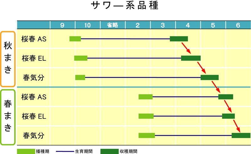 弊社品種を用いたオススメの作型図(奈良県標準)を作成してみました。今回使用する品種は、サワ―系品種である桜春AS・桜春EL・春気分とします。