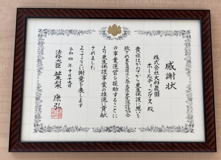 奈良県更生保護事業関係者顕彰式典において法務大臣 葉梨康弘様からの感謝状を拝受いたしました。
