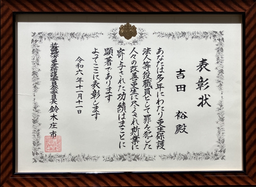 近畿地方更生保護委員会委員長の鈴木 庄市様から表彰状をいただきました。