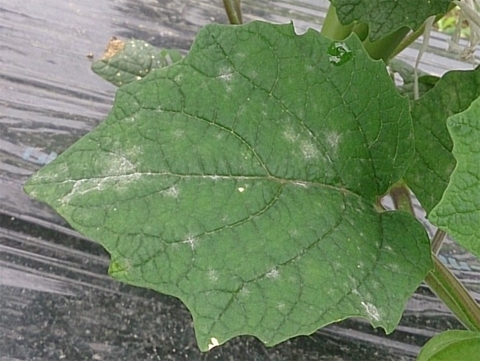 - 葉の表面に点々と白いかびが生じ、次第に葉面全体に広がり、白いうどん粉を振り掛けたようになる。