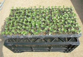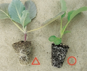 写真2…左は種まき後40日目の苗、右は種まき後25日目の苗です。右側は定植適期苗、左側は根が巻きすぎており老化苗といえます。